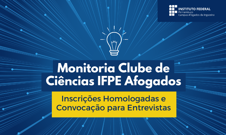 O IFPE Afogados, divulgou nesta quarta (09/04), a Lista de Inscrições Homologadas para a Monitoria do Clube de Ciências, com vigência de abril a dezembro de 2025. Todos/as os/as listados/as deverão participar da entrevista na tarde desta quinta-feira (10/04), a partir das 14h, no Auditório, Bloco A. Os horários de cada entrevista estão detalhados na lista de inscrições abaixo.