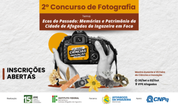 Estão abertas até o dia 24 de setembro as inscrições para o 2º Concurso de Fotografia da VII Feira de Ciências e Inovação, realizada pelo IFPE Campus Afogados da Ingazeira. O tema deste ano será “Ecos do Passado: Memórias e Patrimônio da Cidade de Afogados da Ingazeira em Foco”. As inscrições são feitas exclusivamente pelo formulário disponível no link: https://bit.ly/concursofotoif