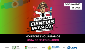 O IFPE Afogados divulgou nesta quinta-feira (11) a lista de estudantes monitores/as voluntários/as para atuarem na VII Feira de Ciências e Inovação de Afogados da Ingazeira que acontece de 30 de setembro a 02 de outubro.