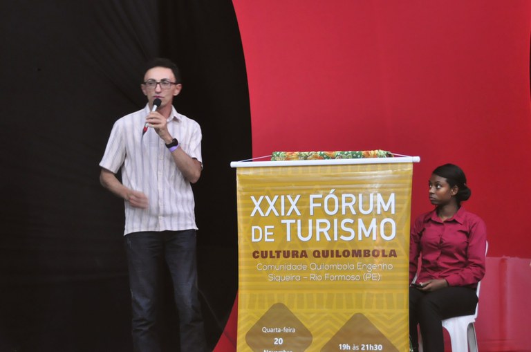 Na noite de 20 de novembro, dia da consciência negra, foi realizado na tenda externa do IFPE Barreiros o 29º Fórum de Turismo. Com foco na comunidade quilombola do Engenho Siqueira, o evento girou em torno da mesa composta por dois moradores da comunidade, Cristiane Correia da Silva e Moacir Correia de Santana, e pela professora titular voluntária do departamento de oceanografia da UFPE, Maria Elisabeth de Araújo. Eles conversaram sobre cultura quilombola, tema do fórum, ressaltando a experiência de preservação e manutenção de uma cultura ainda muito pouco valorizada. “Nem as próprias pessoas da região sabem que existe uma comunidade quilombola ali no Engenho Siqueira. Até pra nós mesmos essa é uma descoberta recente, nós desconhecíamos a nossa origem. Se não houver uma mudança de mentalidade vai ser muito difícil conseguir preservar a cultura própria dos quilombos. Já não temos mais seguidores de religiões de matrizes africanas por exemplo, nem benzedeiras na comunidade”, conta Cristiane, que foi a primeira mulher a se tornar presidente da associação de moradores local.