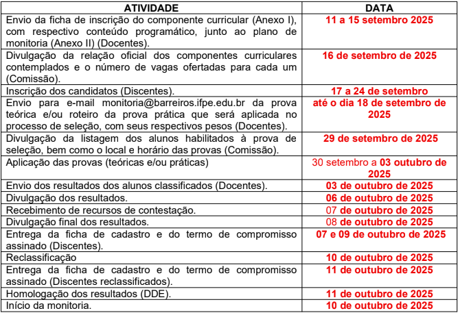 Os docentes-orientadores deverão encaminhar à Comissão de Monitoria os planos de monitoria (anexo II) com os seus respectivos conteúdos programáticos, juntamente à ficha de inscrição do componente curricular (Anexo I), entre os dias 11 a 15 setembro, por meio do formulário disponível aqui. A divulgação da relação oficial dos componentes curriculares contemplados e o número de vagas ofertadas para cada acontecerá no dia 16 de setembro. As inscrições dos/as candidatos acontecerão no período de 17 a 24 de setembro, por meio do formulário disponível aqui.