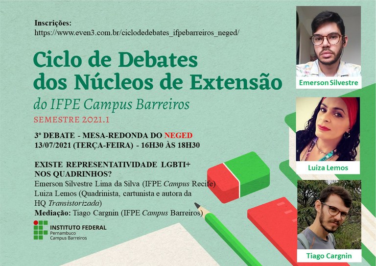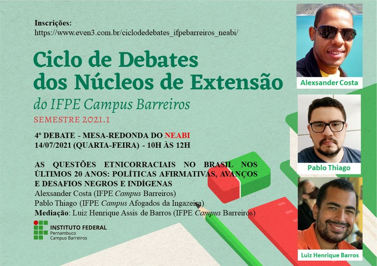 INSCREVA-SE AQUI: https://www.even3.com.br/ciclodedebates_ifpebarreiros_neabi/