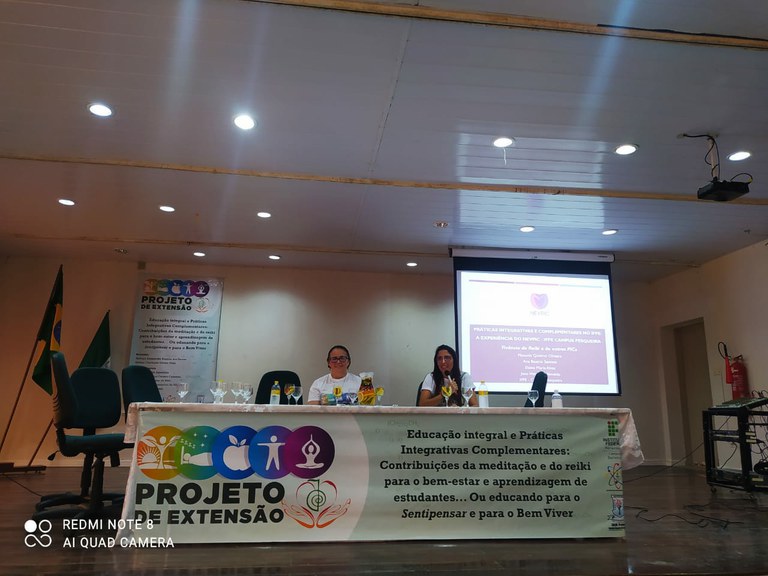 Na sequência, os estudantes de Pesqueira facilitadores de reiki e reikianos do Campus Barreiros, Profa. Amanda Reges e o técnico Tonny Cley Campos, realizaram sessão de reiki para os participantes interessados em vivenciar a prática. Enquanto isso, demais participantes permaneceram no auditório para vivenciar a prática de meditação mindfulness.