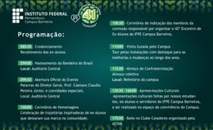 O Instituto Federal de Pernambuco – Campus Barreiros realizará, no dia 30 de agosto de 2025, o 41º Encontro de Ex-Alunos, evento que reafirma o compromisso da instituição com a valorização da memória, da educação pública e das trajetórias que marcaram sua história.