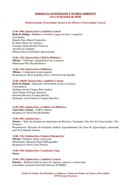 Com o objetivo de promover a reflexão sobre diversidade cultural, sexual e de gênero e de incentivar o respeito ao meio ambiente, o IFPE-Barreiros realiza nos dias 13 e 14 de Junho a Semana da Diversidade e do Meio Ambiente. A entrada é gratuita e aberta ao público em geral. Na programação estão previstas sessões do cineclube com exibição de filmes de temática LGBT, oficinas, apresentações culturais, além de palestras e debates que contemplem a proposta dos idealizadores.