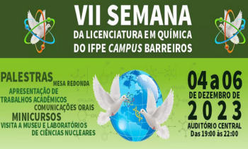 Será realizada, entre os dias 04 e 06 de dezembro, a VII Semana da Licenciatura em Química do IFPE Barreiros. O tema desta edição será “Guerra & Paz: A Química e a Educação em Defesa da Vida”, e vem com a proposta de trazer para o debate o papel das ciências, com destaque para a Química e para a Educação, tanto no que se refere aos conflitos bélicos quanto a sua contribuição para a melhoria da qualidade de vida de todos/as e para a paz.