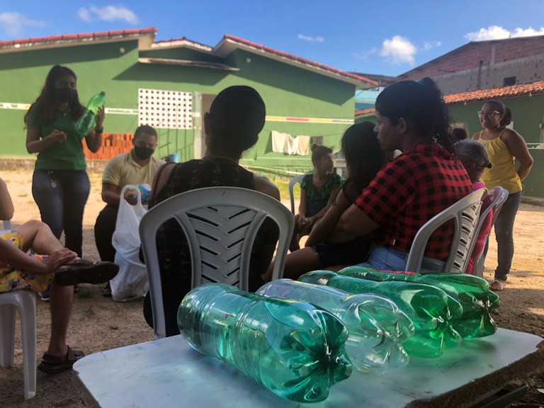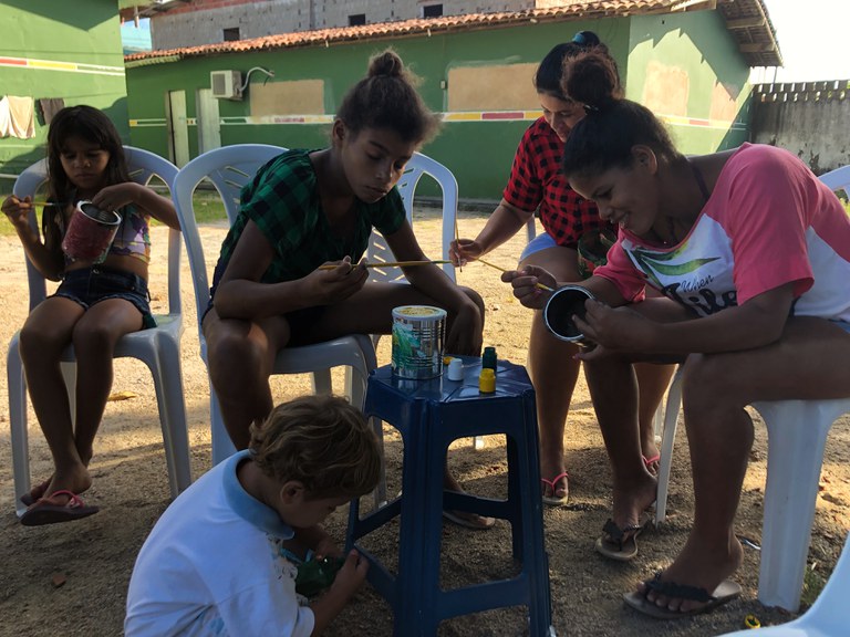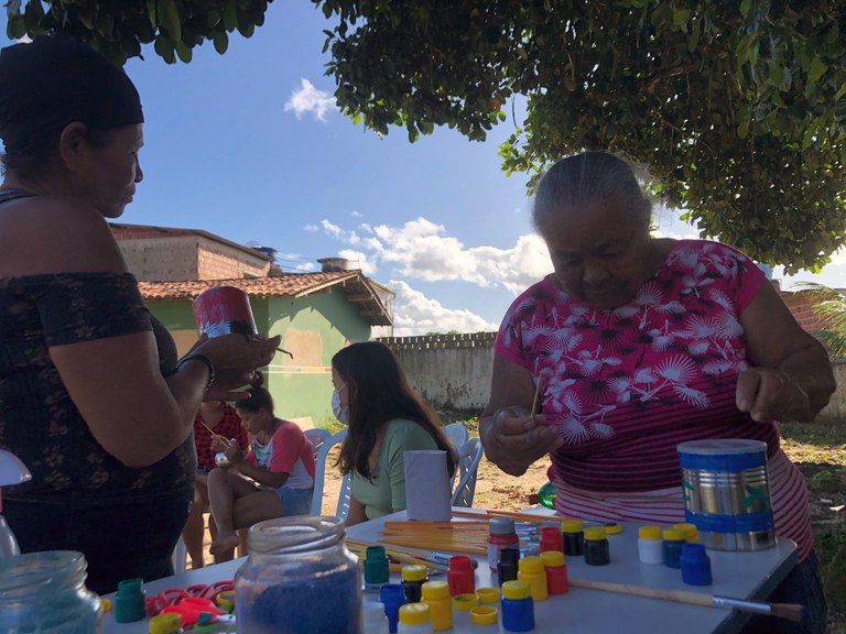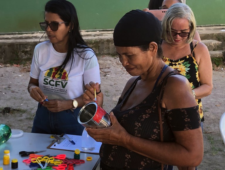 Embaixo de uma árvore, no meio da tarde, algumas mulheres pintam latas de leite e garrafas PET. Elas fazem parte do grupo OPA (O Perfeito Amor), grupo de apoio para mães de crianças com deficiência, e estão no quintal da casa onde acontecem as atividades do Serviço de Convivência e Fortalecimento de Vínculos, coordenação ligada à Secretaria de Ação Social do município de Barreiros. É o primeiro dia da oficina de cultivoterapia, parte do projeto de extensão do IFPE Barreiros, coordenado pela professora Bianca Tavares. Estão preparando vasos que nos próximos encontros devem receber mudas de plantas. “Não tem horas que a gente tem raiva, sente que vai perder o controle? Pode ajudar a se controlar cuidar da plantinha, regar, tratar do solo. Ajuda a lidar com as emoções mais fortes”, explicou para o grupo a psicóloga do IFPE Barreiros, Francielly Lamenha.