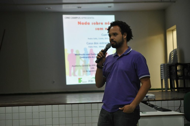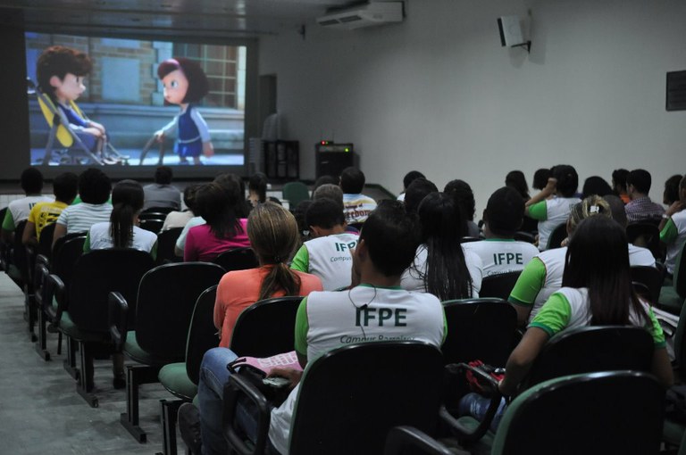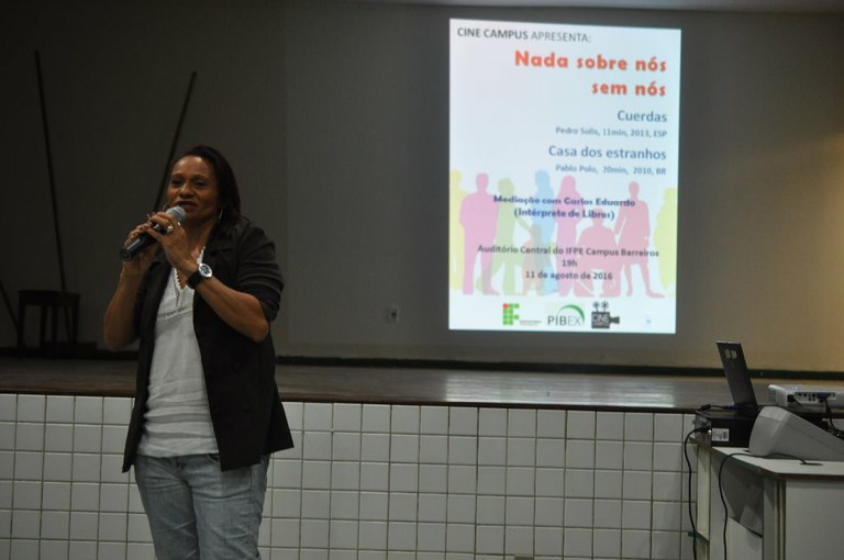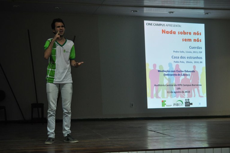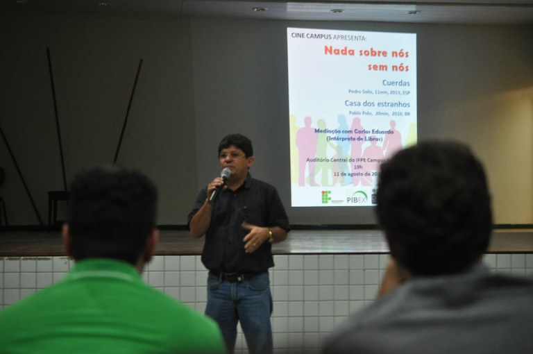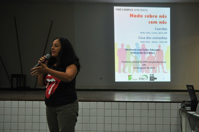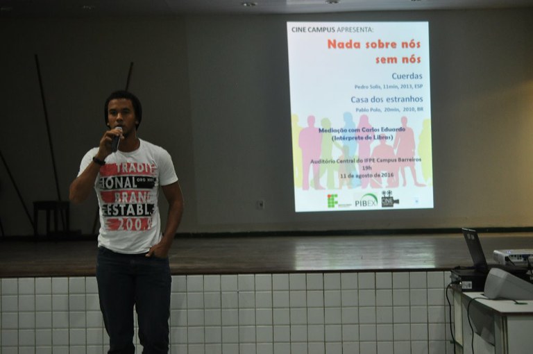 Na sequência, foi a vez do Cine Campus discutir a temática da inclusão a partir da arte cinematográfica. Com o tema “Nada sobre nós sem nós”, o cineclube exibiu dois curtas-metragens: a animação espanhola Cuerdas (2013), de Pedro Solis, e a ficção pernambucana Casa dos Estranhos (2010), de Pablo Polo.o cinema.