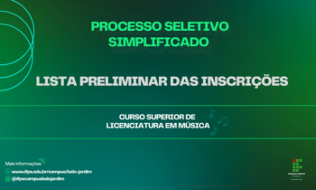 O IFPE Belo Jardim divulgou nesta segunda-feira (17), a Lista Preliminar de Inscrições do Processo Seletivo Simplificado para ingresso no Curso de Licenciatura em Música. O prazo para recursos é esta terça-feira (18), por meio do formulário disponível no link: https://forms.gle/yVGwrrve4p2EgdtY8