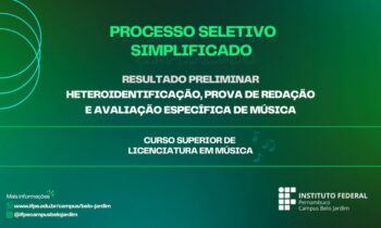 O IFPE Belo Jardim divulgou nesta sexta (28), a lista com o resultado preliminar da heteroidentificação de pessoas autodeclaradas pretos, pardos ou indígenas, da avaliação específica de música e da prova de redação dos candidatos/as inscritos/as na Seleção Simplificada para o Curso de Licenciatura em Música.