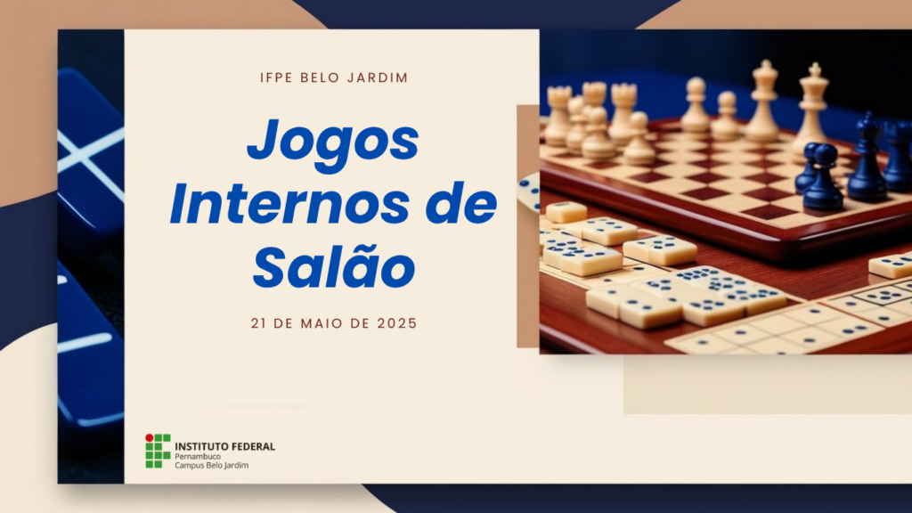 Estão abertas até o próximo domingo (18) as inscrições para os Jogos Internos de Salão do IFPE Belo Jardim, que acontecerão no dia 21 de maio nas modalidades de xadrez, tênis de mesa, dominó e damas.