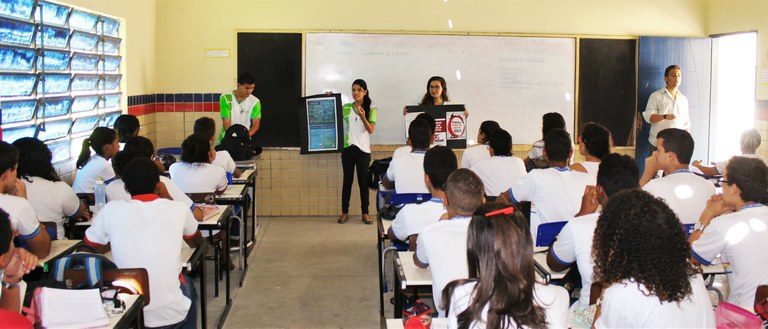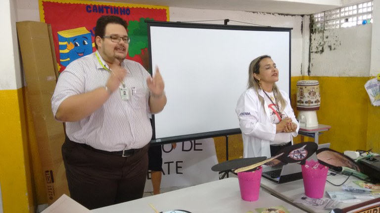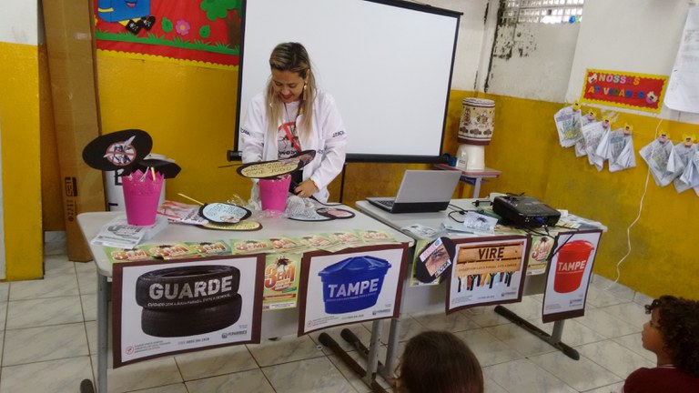 Os estudantes realizaram palestras nas salas de aulas orientando outros alunos a evitar os focos do mosquito. Panfletos com orientações também foram distribuídos.