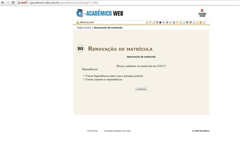 Caso o procedimento não seja realizado no prazo através da internet, o estudante deverá realizar a matrícula presencial, através de requerimento na CRADT, na sala A03, no período de 19 de julho a 27 de julho. Caso algum estudante esteja sem acesso ao Q-Acadêmico, procurar a CRADT, na Sala A-03, das 07h30min às 16h30min. As aulas do próximo semestre começam no dia 19 de julho.