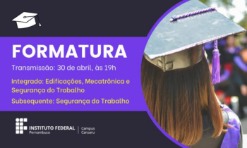 Na próxima sexta-feira (30), o IFPE Caruaru promove a formatura das turmas do integrado em Segurança do Trabalho, Edificações e Mecatrônica e do subsequente em Segurança do Trabalho. Por conta da pandemia de Covid-19, o evento será virtual, com transmissão pelo canal do Campus no Youtube. A cerimônia vai começar às 19h. O link está disponível abaixo.