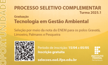 O Instituto Federal de Educação, Ciência e Tecnologia de Pernambuco (IFPE), por meio da Diretoria de Educação a Distância (DEaD), lançou nesta terça-feira (15), edital do processo seletivo complementar gratuito para preenchimento de vagas remanescentes do processo de ingresso simplificado para o curso superior (tecnólogo) de Tecnologia em Gestão Ambiental – Turma 2025.1. A oportunidade é destinada aos polos EaD de Gravatá, Limoeiro, Palmares e Pesqueira. A oferta se dá no âmbito do programa Universidade Aberta do Brasil (UAB), do Ministério da Educação (MEC).