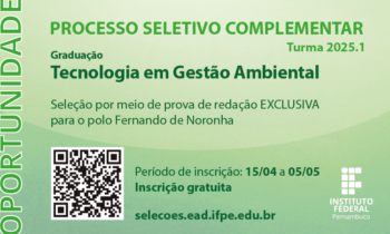 O Instituto Federal de Educação, Ciência e Tecnologia de Pernambuco (IFPE), por meio da Diretoria de Educação a Distância (DEaD), lançou nesta terça-feira (15), edital de processo seletivo complementar gratuito para preenchimento de vagas remanescentes do processo de ingresso simplificado para o curso superior (tecnólogo) de Tecnologia em Gestão Ambiental – Turma 2025.1. A oportunidade é voltada exclusivamente para residentes e trabalhadores/as da Ilha de Fernando de Noronha. A oferta se dá no âmbito do programa Universidade Aberta do Brasil (UAB), do Ministério da Educação (MEC).