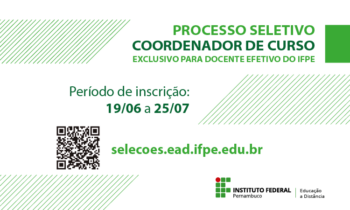 Inscrição – A inscrição será realizada até o dia 25/07, por meio do site http://selecoes.ead.ifpe.edu.br/, seguindo os critérios, instruções e documentação descritas no edital.