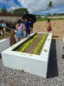 Dentro da ação, foram construídos seis canteiros de alvenaria para o cultivo de hortaliças em sistema de consórcio agroecológico. Enquanto a RBBC financiou integralmente a implantação e construção desse espaço, o IFPE contribuiu com a disponibilização do terreno, o fornecimento de água e a realização de uma oficina formativa sobre hortas agroecológicas em pequenos espaços, dividida em dois módulos. Os módulos formativos ocorreram nos dias 19/03 e 27/03, abordando temas como implantação, manejo e manutenção de hortas, além do aproveitamento de resíduos orgânicos para produção de compostagem.