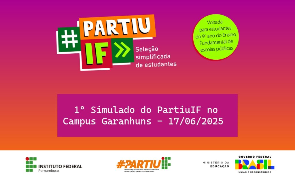 O IFPE Campus Garanhuns dá a largada para o Processo de Ingresso 2026.1 com a realização do 1º Simulado do PartiuIF, que acontecerá na próxima terça-feira, dia 17 de junho, das 14h às 17h, na Sala 4, Bloco B da instituição.