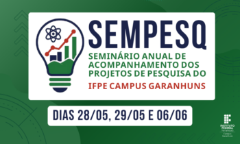O IFPE Campus Garanhuns, por meio da Divisão de Pesquisa (Dpesq), divulgou a programação Seminário Anual de Acompanhamento dos Projetos de Pesquisa (Sempesq), em que estudantes pesquisadores do Campus apresentarão as ações já executadas dos planos de atividades vinculados aos projetos de pesquisa. As apresentações acontecerão nos dias 28/05, 29/05 e 06/05, nos seguintes locais e horários: