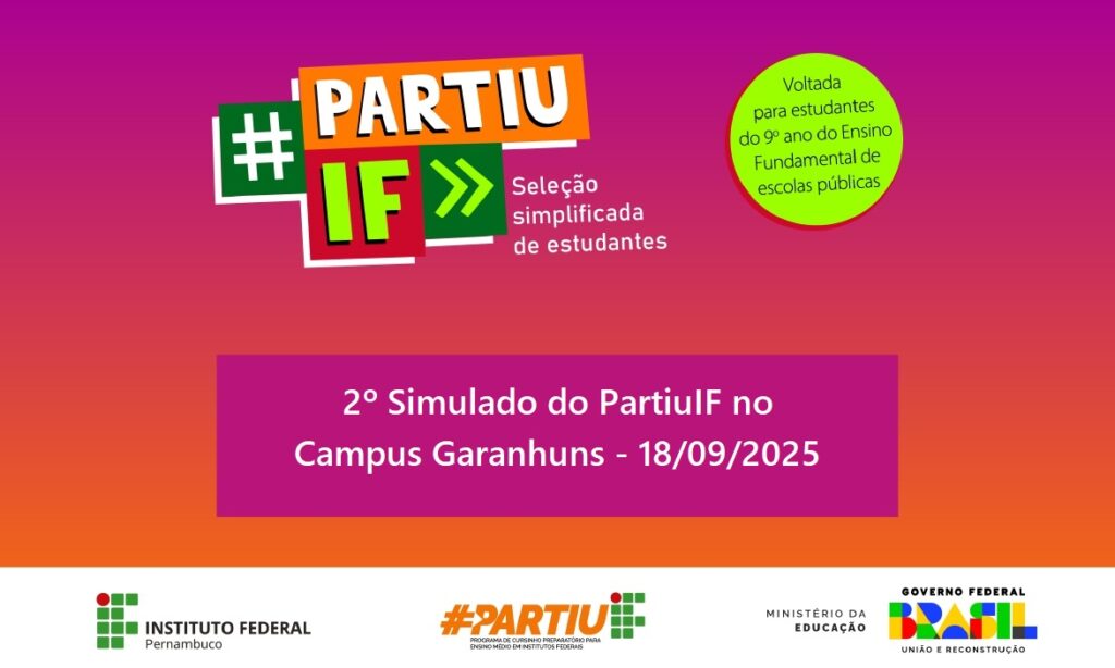 O IFPE Campus Garanhuns realizará, no dia 18 de setembro, o 2º Simulado do PartiuIF, das 14h às 17h, na Sala 4, Bloco B da instituição. A ação marca o início das atividades preparatórias voltadas para estudantes que desejam participar do Processo de Ingresso 2026.1 para os cursos técnicos integrados do IFPE no próximo ano.