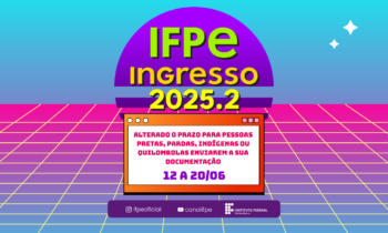 O Instituto Federal de Pernambuco – IFPE comunica a alteração no prazo para o envio da documentação de aferição da condição autodeclarada dos/as candidatos/as que se inscreveram no Processo de Ingresso 2025.2 nas vagas para pessoas Pretas, Pardas, Indígenas ou Quilombolas. O novo prazo será de 12 a 20 de junho. Os/as candidatos interessados/as deverão enviar dentro deste prazo a documentação exigida no item 5 do edital.