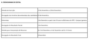 ENTREVISTAS – Os horários das entrevistas dos candidatos serão divulgados no dia 29 de novembro. As entrevistas serão realizadas no dia 2 de de dezembro, a partir das 9 horas, na Biblioteca do IFPE Campus Igarassu. O resultado parcial da seleção será divulgado no dia 3 de dezembro. No dia 04/12 será divulgado o resultado final.