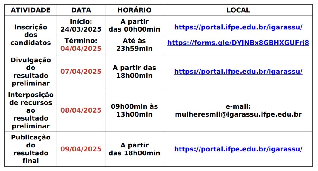 O IFPE Campus Igarassu publicou, nesta segunda-feira (31), uma retificação do Edital CIGR/IFPE Nº 09, DE 24 DE MARÇO DE 2025, que prevê a alteração do Cronograma da Seleção Simplificada de Docentes para os Cursos de Formação Inicial e Continuada (FIC) do Programa Mulheres Mil – IFPE. Esse Edital é EXCLUSIVO PARA NÃO SERVIDORES DO IFPE. Também foi publicada a PORTARIA CIGR/IFPE Nº 172, DE 28 DE MARÇO DE 2025, que aprova a retificação do Edital.