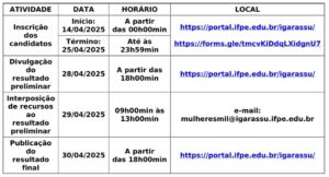 A interposição de recursos contra o resultado preliminar deve ser realizada por e-mail (mulheresmil@igarassu.ifpe.edu.br), nesta terça-feira (29), das 9h às 13h. O resultado final após recursos será divulgado no próximo dia 30 de abril.