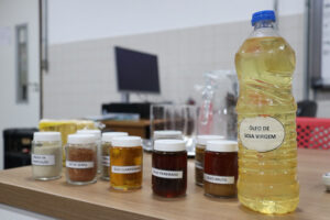 O galão para coleta foi colocado na área de convivência, próximo à cantina. Todas as pessoas da comunidade e entorno podem fazer o descarte do óleo de uso doméstico: ele deve ser acondicionado em garrafas PET e colocado dentro do galão (dentro da embalagem mesmo – o projeto se encarregará de reciclar também o PET). O projeto fabrica sabão em barra a partir do óleo usado, e reverte a renda da comercialização do sabão para o IMIP.