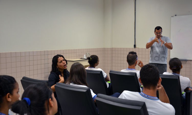 LIBRAS – Uma das atividades da Semana recebeu sete alunos surdos da Escola de Ensino Médio Domingos Albuquerque do Cabo de Santo Agostinho. O professor de LIBRAS Marcos Gonçalves da Silva ofertou a oficina “Produções e Registros em Libras”; estudantes do curso de Licenciatura em Química do Campus Ipojuca, que têm LIBRAS no currículo, também participaram e tiveram oportunidade de treinar a língua. A professora Niviane Araújo, da escola Domingos de Albuquerque acompanou os estudantes e atuou como intérprete nas demais atividades da Semana.