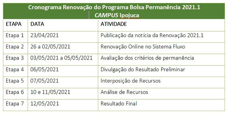 A Assistência Estudantil do IFPE-Campus Ipojuca divulgou, nesta sexta-feira (23), o cronograma de renovação do Programa Bolsa Permanência para o semestre 2021.1.