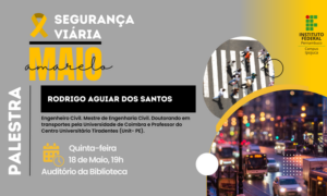 No dia 18/05, às 19:00, no auditório da Biblioteca do IFPE Campus Ipojuca, teremos uma palestra de extrema importância sobre o tema “Segurança Viária e Maio Amarelo”. O palestrante será o renomado Mestre de Engenharia Civil, Rodrigo Aguiar dos Santos. Rodrigo Aguiar dos Santos é um engenheiro especializado em transportes, doutorando pela Universidade de Coimbra e professor no Centro Universitário…