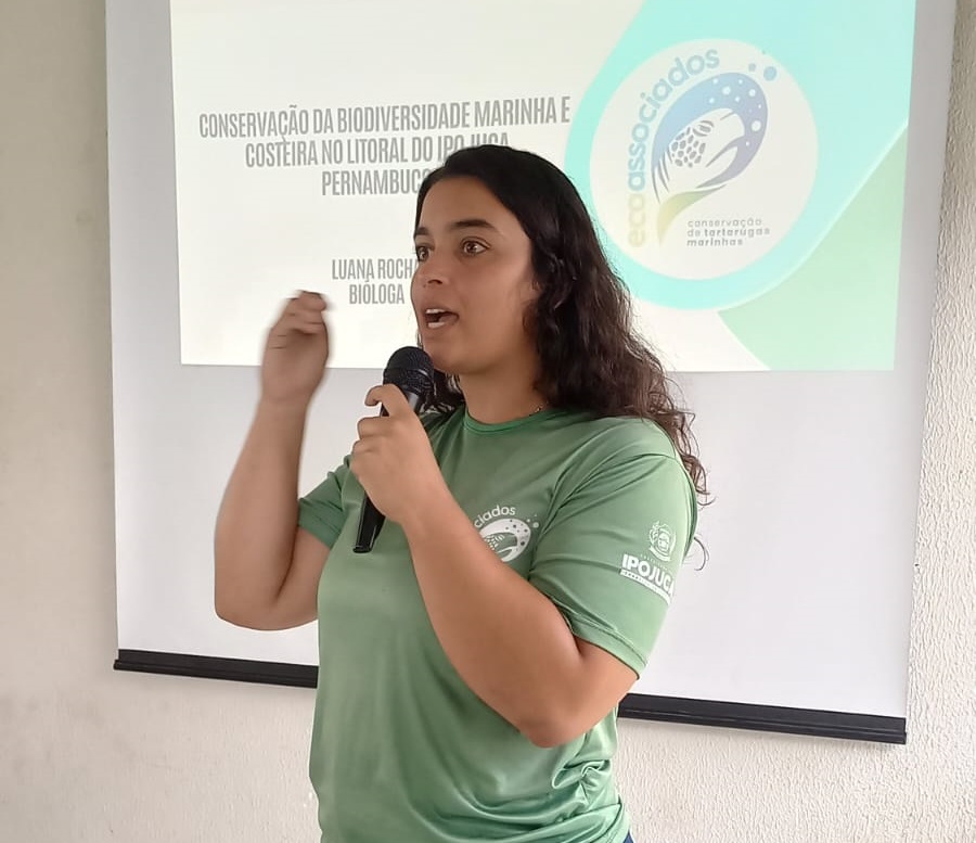 Mediada pela professora do campus Aline Clemente, a atividade teve início com a fala da bióloga, que apresentou o trabalho realizado pela ONG na conservação de tartarugas marinhas e na conscientização da população das áreas litorâneas próximas ao município de Ipojuca.