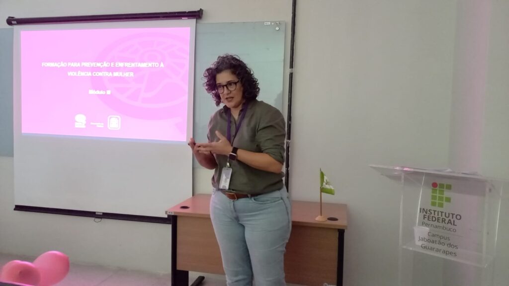 Após pausa para lanche, as estudantes assistiram à aula inaugural da disciplina “Formação para Prevenção e Enfrentamento à Violência Contra a Mulher”, ministrada pela professora Jailma Oliveira, na qual trataram sobre os preconceitos, desafios e perigos que as mulheres enfrentam diariamente no contexto local e nacional.