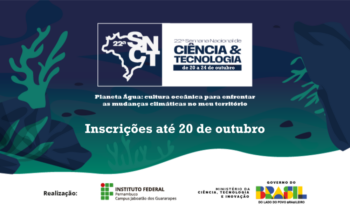 As inscrições para a 22ª Semana Nacional de Ciência e Tecnologia (SNCT) no IFPE Campus Jaboatão dos Guararapes encerram no dia 20 de outubro de 2025. A edição deste ano terá como tema “Planeta Água: cultura oceânica para enfrentar as mudanças climáticas no meu território”.