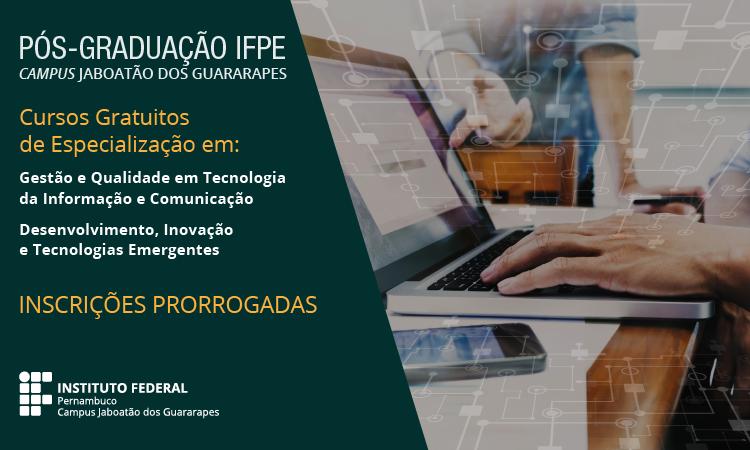 Foram prorrogadas, nesta sexta (22), as inscrições para seleção de candidatos para preenchimento das vagas dos cursos de Especialização em Gestão e Qualidade em Tecnologia da Informação e Comunicação e de Especialização em Desenvolvimento, Inovação e Tecnologias Emergentes. Os cursos são oferecidos pelo Campus Jaboatão dos Guararapes do Instituto Federal de Educação, Ciência e Tecnologia de Pernambuco (IFPE). Agora, as inscrições poderão ser realizadas até o dia 31 de janeiro, no site: processoseletivopos.jaboatao.ifpe.edu.br, segundo documentação e orientações contidas no edital. Tanto as inscrições quanto a oferta dos cursos são gratuitas. As aulas serão presenciais e acontecerão no próprio campus, com previsão de início para 19 de abril de 2021.