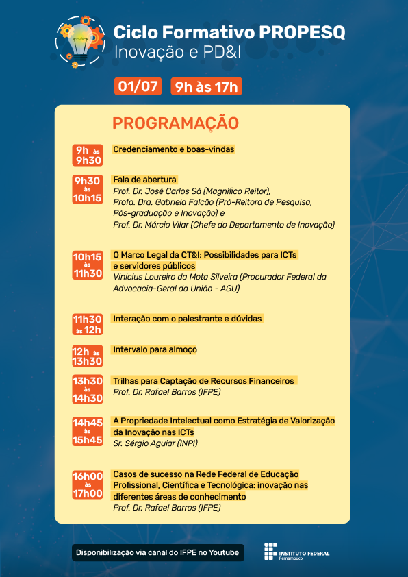 O Instituto Federal de Pernambuco (IFPE), por meio da Pró-reitoria de Pesquisa, Pós-graduação e Inovação (Propesq), estabelece nova data para promoção do o ciclo formativo em Pesquisa, Desenvolvimento e Inovação (PD&I), evento que visa fortalecer a cultura de inovação e o ecossistema de pesquisa aplicada no Instituto.