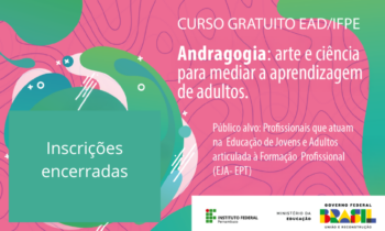 Devido ao elevado número de inscritos/as, o Instituto Federal de Pernambuco (IFPE), por meio da Diretoria de Educação à Distância e da Pró-Reitoria de Ensino, encerrou o prazo de inscrições para o curso de formação continuada “Andragogia: arte e ciência para mediar a aprendizagem de adultos”.