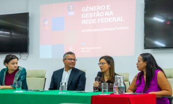 Após a apresentração cultural, foi realizada a palestra “Gênero e gestão na Rede Federal: um olhar para a liderança feminina”, ministrada pela reitora do IFPA, com mediação da chefe do Departamento de Relações Internacionais (DRIn), Carol Bello.