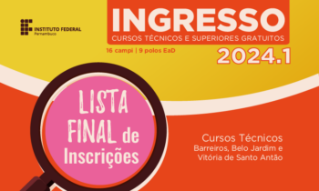 O Instituto Federal de Educação, Ciência e Tecnologia de Pernambuco (IFPE) divulgou, nesta quarta-feira (06), a lista final das inscrições dos/as candidatos/as aos cursos técnicos dos campi agrícolas Barreiros, Belo Jardim e Vitória de Santo Antão do Processo de Ingresso 2024.1. A lista pode ser conferida no site: ingresso.ifpe.edu.br.
