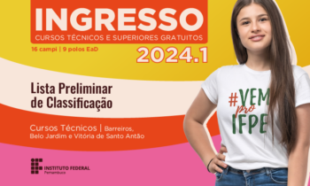 O Instituto Federal de Educação, Ciência e Tecnologia de Pernambuco (IFPE) divulgou a lista preliminar de classificação dos/as candidatos/as aos cursos técnicos dos campi agrícolas Barreiros, Belo Jardim e Vitória de Santo Antão do Processo de Ingresso 2024.1. A lista pode ser conferida no site: ingresso.ifpe.edu.br.