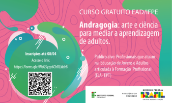 O Instituto Federal de Educação, Ciência e Tecnologia de Pernambuco (IFPE), por meio da Diretoria de Educação à Distância e da Pró-Reitoria de Ensino, abre inscrições para o curso de formação continuada “Andragogia: arte e ciência para mediar a aprendizagem de adultos”. Voltado para profissionais da Educação de Jovens e Adultos (EJA) e da Educação Profissional e Tecnológica (EPT), o curso tem como objetivo aprofundar os conhecimentos sobre a mediação do aprendizado de adultos, unindo teoria e prática para aprimorar as habilidades pedagógicas dos educadores.