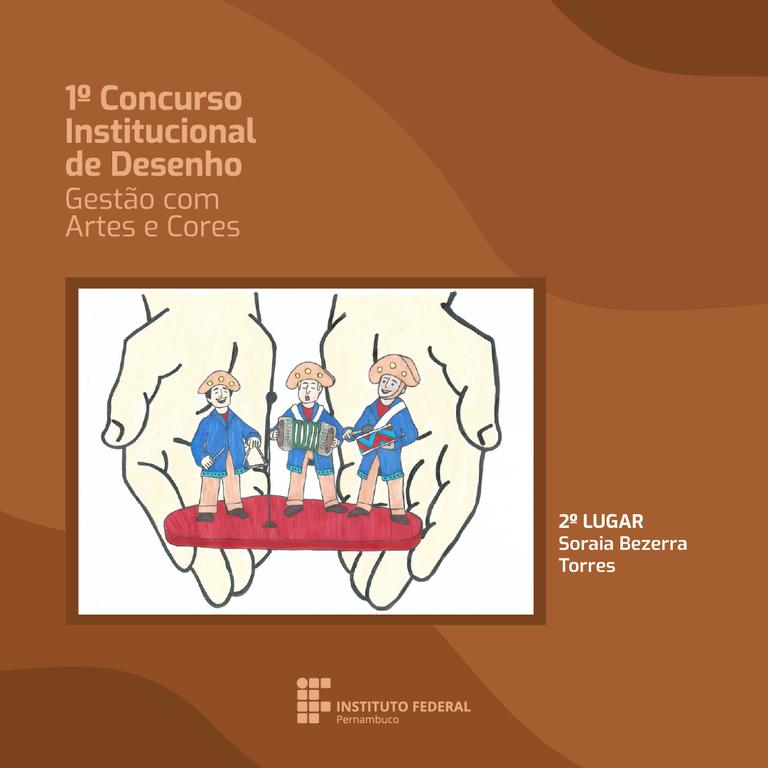 0 1º lugar ficou com Ita Pritsch Simões Pires, aluna do curso técnico em Artes Visuais do Campus Olinda, que foi contemplada com uma mesa digitalizadora e um troféu. Em 2º lugar ficou Soraia Bezerra Torres, estudante da Especialização em Docência para a Educação Profissional e Tecnológica da EaD, que recebeu uma medalha. Já o 3º lugar foi ocupado por Ian Matias Silva, aluno do curso técnico em Eletrotécnica do Campus Recife, que também ganhou uma medalha pelo seu trabalho.