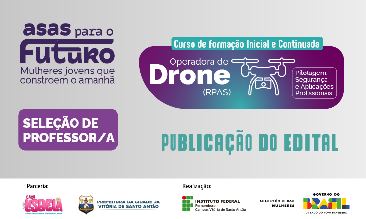 O IFPE Campus Vitória de Santo Antão publicou, nesta segunda-feira (06), o Edital nº 07/2026, referente à seleção simplificada de docentes para atuação no curso Operadora de Drone (RPAS) – Pilotagem, Segurança e Aplicações Profissionais. As inscrições são gratuitas e devem ser realizadas no período de 14 a 20 de abril, exclusivamente por e-mail.