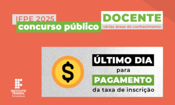 O prazo para pagamento da taxa de inscrição do Concurso Público para Professor/a do Ensino Básico, Técnico e Tecnológico (EBTT) do Instituto Federal de Educação, Ciência e Tecnologia de Pernambuco (IFPE) termina nesta sexta-feira, 29 de agosto. Apenas os candidatos que quitarem a taxa no valor de R$ 220,00 estarão efetivamente inscritos no certame. O pagamento pode ser realizado via Pix ou boleto bancário.