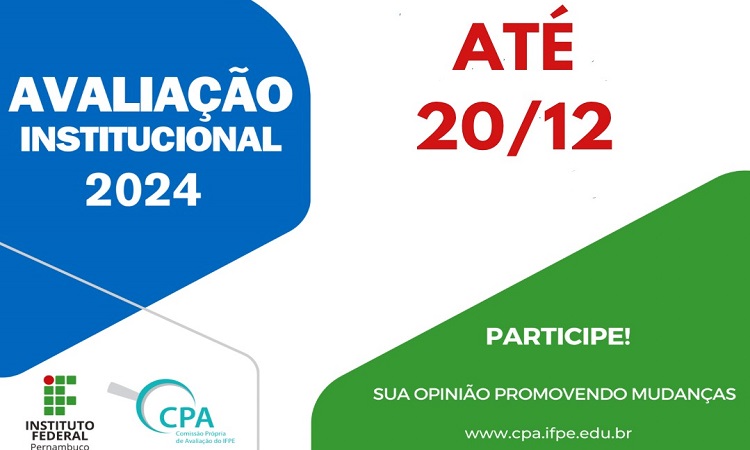 A Comissão Própria de Avaliação (CPA) do IFPE prorrogou o prazo final para realização da avaliação institucional até o dia 20/12. De acordo com o presidente da CPA, o Prof. Vilmar Nepomuceno, essa prorrogação permitirá uma maior participação da comunidade acadêmica na avaliação, de modo a aumentar a representatividade dos dados coletados no diagnóstico dos pontos fortes e a melhorar de nossas políticas e práticas institucionais, de modo a guiar as decisões sobre essas.