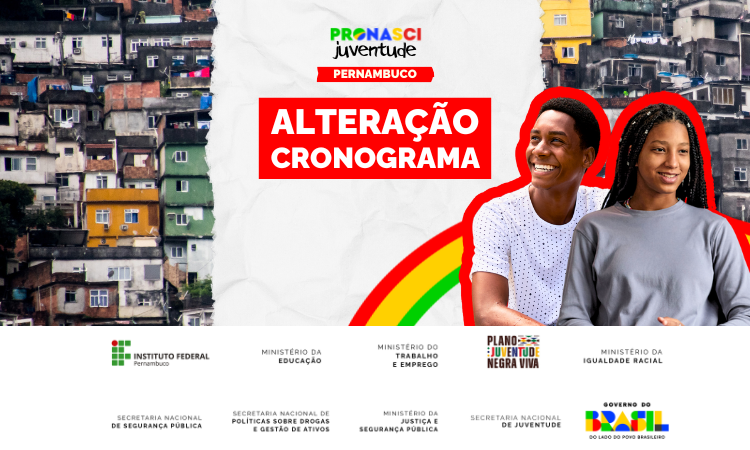 O Pronasci Juventude é uma iniciativa da Secretaria Nacional de Políticas sobre Drogas e Gestão de Ativos (Senad), vinculada ao Ministério da Justiça e Segurança Pública, e tem como objetivo fortalecer projetos de vida e prevenir situações de violência entre adolescentes e jovens em contextos de vulnerabilidade social. Em Pernambuco, o programa é executado pelo IFPE e contempla jovens residentes nos territórios do Cordeiro, Ibura e Joana Bezerra, no Recife, e de Gaibu e Ponte dos Carvalhos, no Cabo de Santo Agostinho.