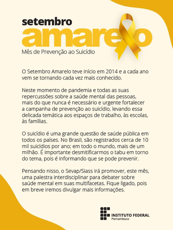 Com intuito de fortalecer as ações de prevenção ao suicídio que ocorrem no mês de setembro, a SEVAP/SIASS convida os servidores a participar de uma palestra on-line sobre a temática. A atividade integra a campanha Setembro Amarelo promovida na instituição.
