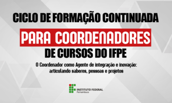 Será realizado, nos dias 26, 27 e 28 de novembro, o I Ciclo de Formação Continuada para Coordenadores de Curso do IFPE. O evento acontecerá de forma online e terá como tema geral “O/a Coordenador/a como agente de integração e inovação: articulando saberes, pessoas e objetos”.